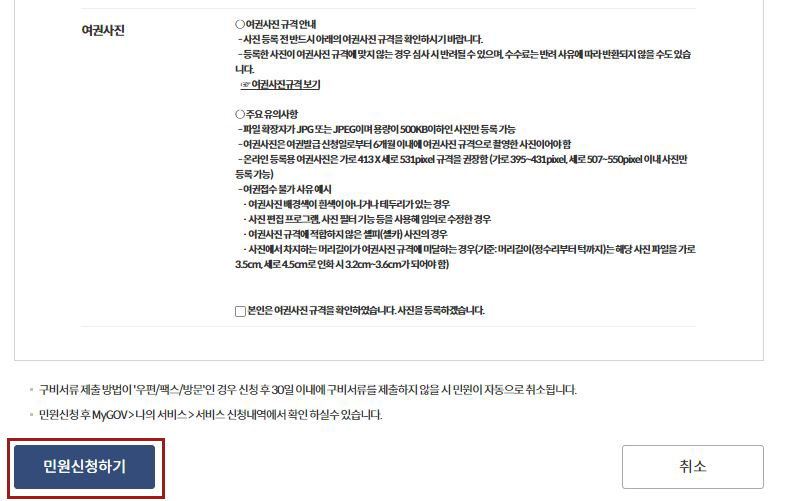 6. 여권사진을 업로드하여 민원신청하기 버튼을 클릭합니다. 여권사진은 발급신청에서 중요한 단계라고 할 수 있습니다.