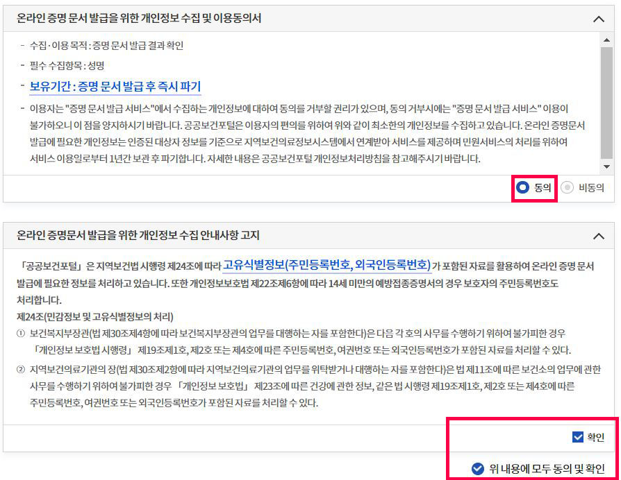 2. 개인정보 이용동의서 동의 및 확인을 체크합니다.